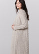 The Lodie is an elegant cable-knit duster cardigan spun from luxuriously soft Alpaca and merino wool. This sumptuous knit features a ribbed cuff and neckline and hits at the mid-calf. This extra-cozy sweater combines the ease of a pullover with the sophistication of a robe.