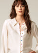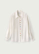 Two details set this blouse apart: the silk wool seersucker fabric and multi-coloured gum drop buttons. The unique fabric—sourced from Italy— adds a touch of vintage flair. The elongated lapels and slightly shirred cuff add a 70s touch.