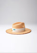 - 2" tonal grosgrain band with hand-stitched fish artwork